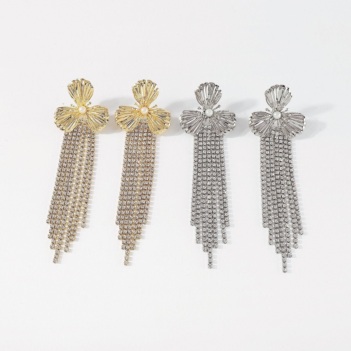 193 Exaggerated Long Earrings Claw Chain Tassel Rhinestone Temperament Light Luxury Earrings Sweet Cool Flower Earrings