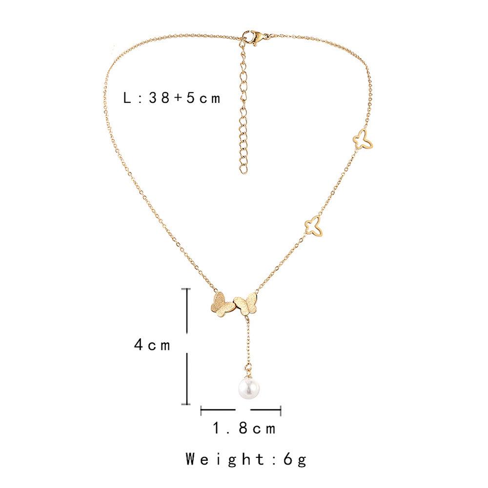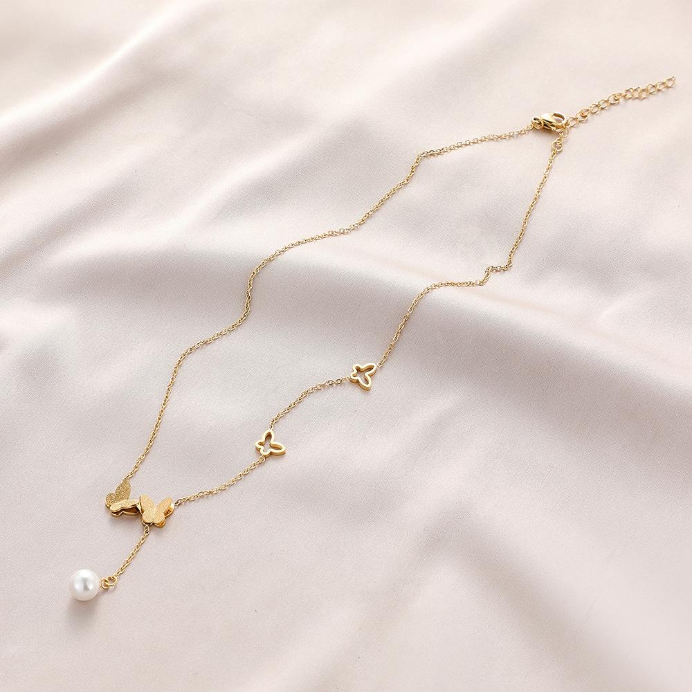Fashion Creative Titanium Steel Asymmetric Double Butterfly Pearl Pendant Stainless Steel Tassel Clavicle Necklace For Women