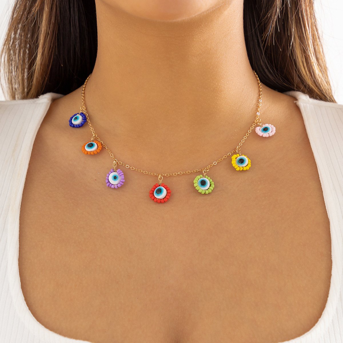Jewelry Creative Beaded Rice Bead Tassel Eye Pendant Necklace Simple Acrylic Geometric Necklace