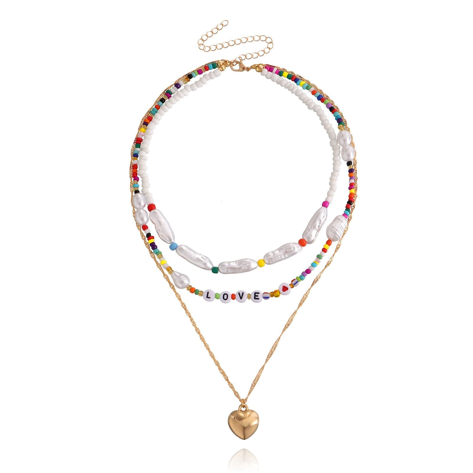 Jewelry multi-layer color rice beads LOVE letter peach heart pendant necklace female niche creative necklace