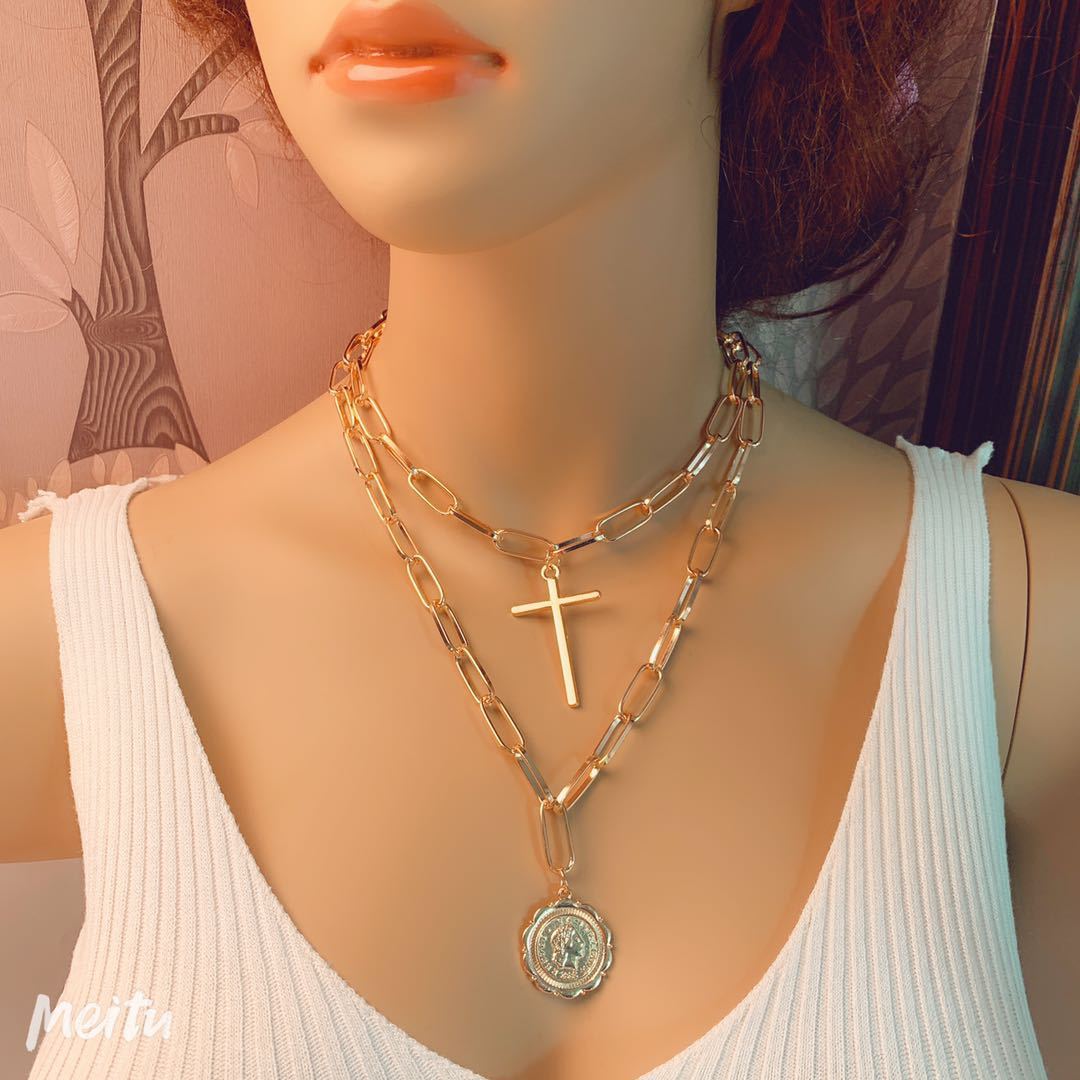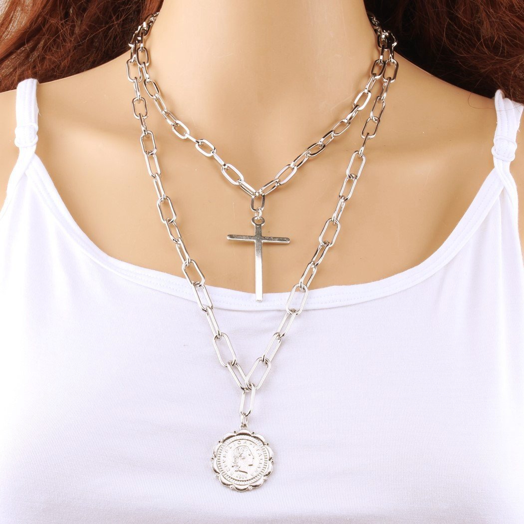 Jewelry Punk Retro Exaggerated Queen Image Necklace Multi Layered Cross Two Piece Sweater Chain